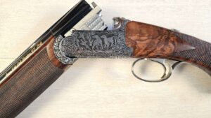 Fucile sovrapposto FPA mod. Zircon Extra cal. 410 canna cm. 71 con strozzatori interni. Monogrillo selettivo, estrazione automatica, splendida incisione eseguita a mano, calcio Principe di Galles in radica di…